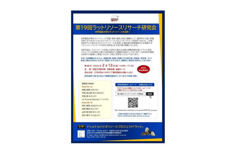 NBRP-Ratでは、ラットリソースを活用した最先端の成果事例などを発表するラットリソースリサーチ研究会を開催いたします。ラット研究に関心のあるどなたもご参加いただけます。是非ご参加ください。開催日:2026年2月13日 […]